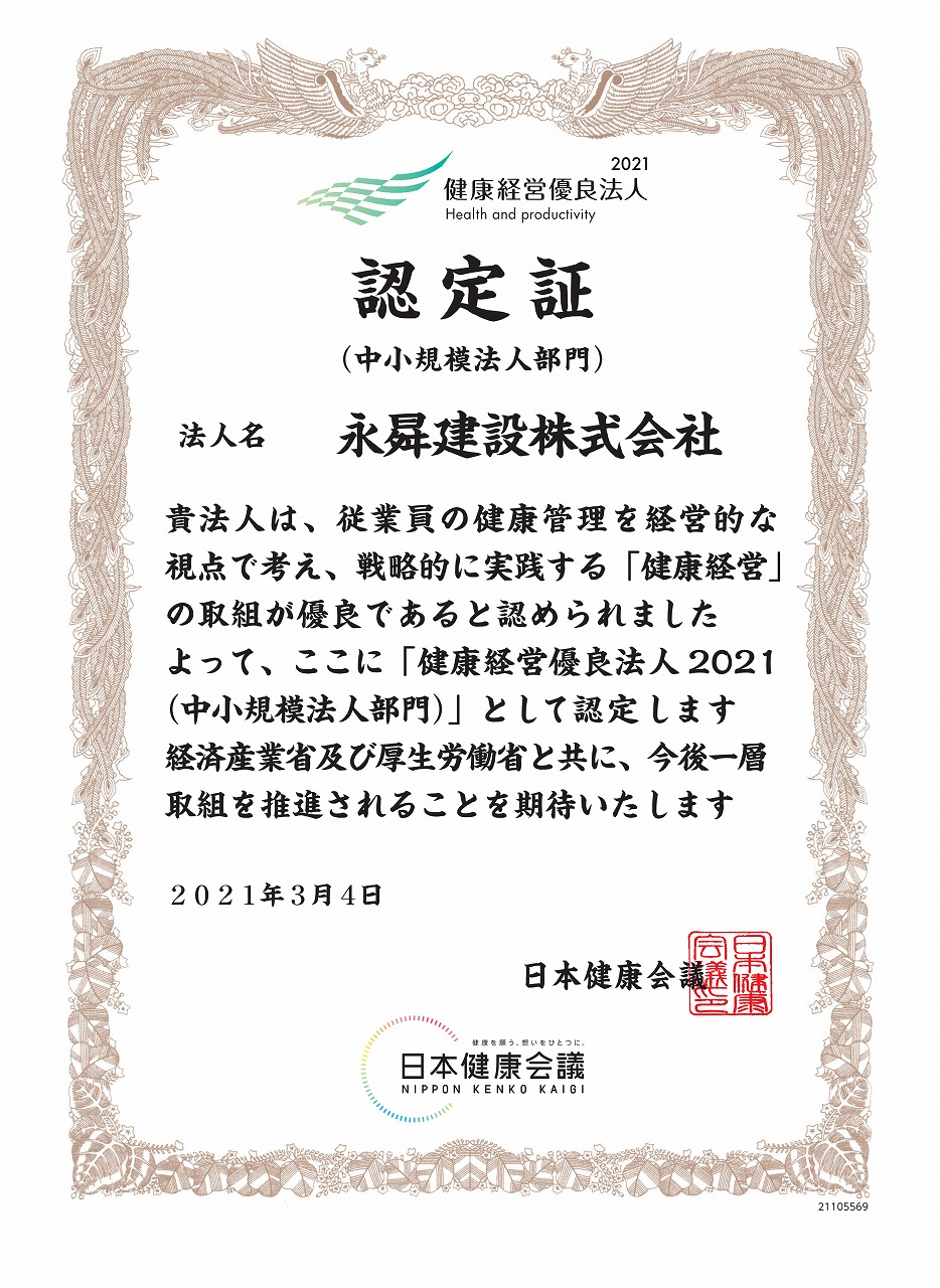 健康経営優良法人2021として認定されました。 2021.05.10 健康経営優良法人2021として認定されました。今年の目標も、喫煙者を減らすことです。 まず本社、屋内・屋外全面禁煙を実施しました。 協会けんぽからの医師コラム等の健康情報を全社員に配布して、健康への意識を高めています。 Share NEWS一覧 2025.03.12 健康経営優良法人2025(中小規模法人部門)に認定されました。 2024.03.12 健康経営優良法人2024として認定されました。 2023.03.09 健康経営優良法人2023として認定されました。 2022.12.08 SDGs行動宣言いたします。 2022.03.10 健康経営優良法人2022として認定されました。 2021.12.11 愛知県健康経営推進企業に登録しました。 2021.11.09 ISO14001 取得いたしました。 2021.05.11 施工実績を更新しました。(4件) 2021.05.10 健康経営優良法人2021として認定されました。 2020.03.24 健康経営優良法人2020として認定されました。