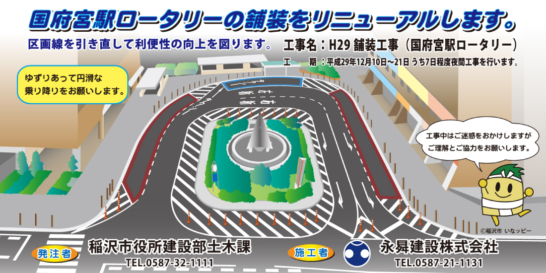名鉄名古屋本線国府宮駅西側ロータリーについて、駅をご利用する皆様の利便性向上を図るため、舗装工事・区画線工事等を行います。