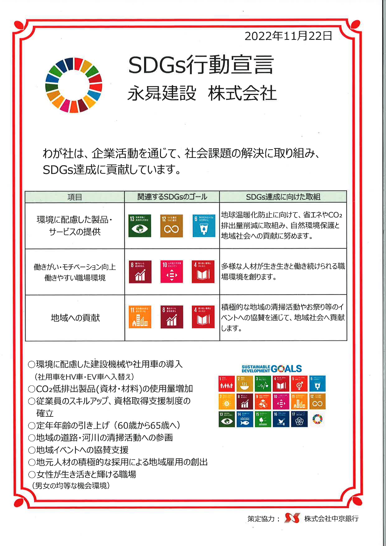SDGs行動宣言いたします。 2022.12.08 SDGs行動宣言いたします。 企業活動を通じて、社会課題の解決に取り組み、SDGs達成に貢献しています。 Share NEWS一覧 2025.03.12 健康経営優良法人2025(中小規模法人部門)に認定されました。 2024.03.12 健康経営優良法人2024として認定されました。 2023.03.09 健康経営優良法人2023として認定されました。 2022.12.08 SDGs行動宣言いたします。 2022.03.10 健康経営優良法人2022として認定されました。 2021.12.11 愛知県健康経営推進企業に登録しました。 2021.11.09 ISO14001 取得いたしました。 2021.05.11 施工実績を更新しました。(4件) 2021.05.10 健康経営優良法人2021として認定されました。 2020.03.24 健康経営優良法人2020として認定されました。