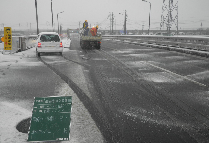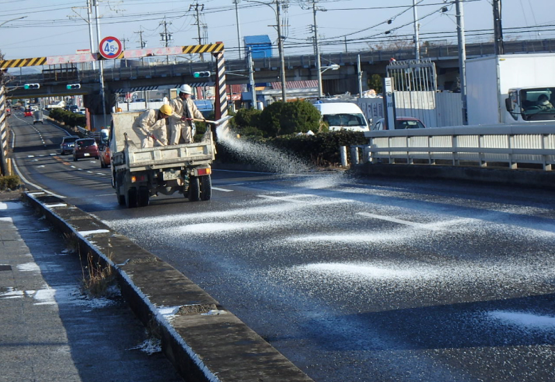我社は冬季降雪時に愛知県一宮建設事務所及び稲沢市から委託をうけ、地域の皆様が安全に車を運転していただけるよう凍結防止剤を散布しております。気温が最も低下する深夜・早朝に行うことが多く楽な仕事ではありませんが、安全走行を守るために責任と誇りを持って業務にあたっております。